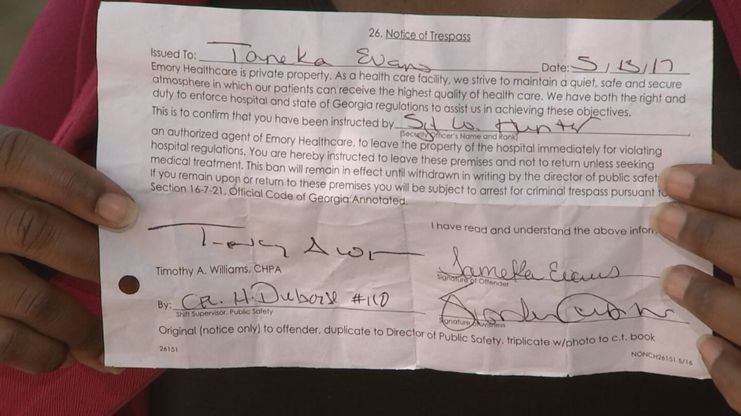"Emory Healthcare is continuing to review this situation. The document issued is not a ticket -- it is a notice stating that the hospital is private property, and is available for our patients and their visitors.