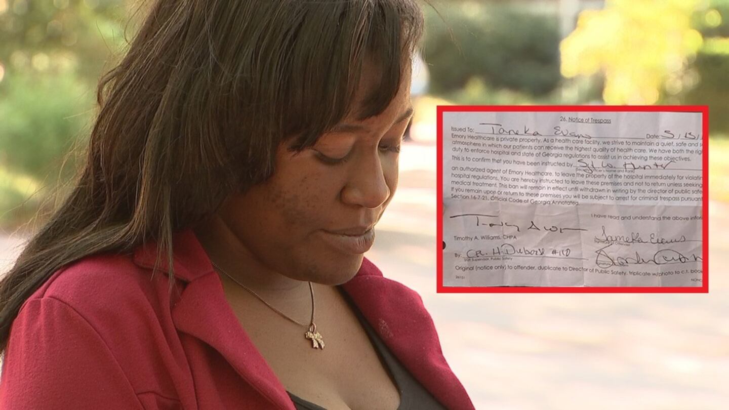 ATLANTA — A pregnant woman says she was handed a notice of trespass after using the restroom at a northeast Atlanta hospital.