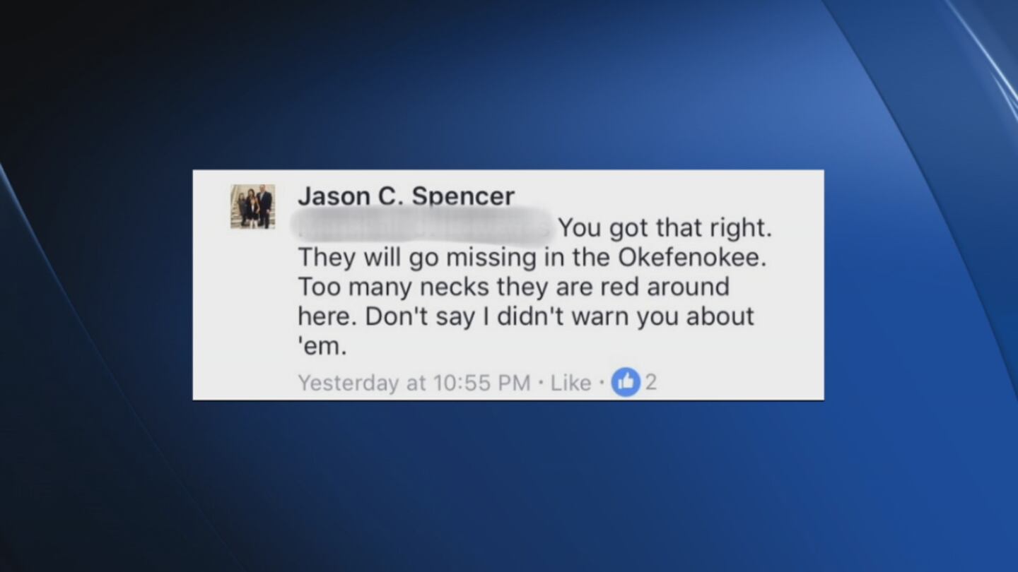 During the debate over the proposed removal of confederate monuments, Spencer wrote, "They will go missing in the Okefenokee. Too many necks, they are red around here. Don't say I didn't warn you about them."