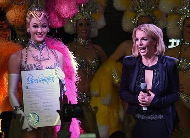 Singer Britney Spears (R) and cast members from the 'Jubilee' show attend a 'Britney Day' event at The LINQ Promenade held to celebrate Spears' Las Vegas residency show 'Britney: Piece of Me' on November 5, 2014 in LV. (Ethan Miller/Getty Images)