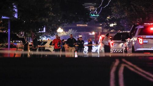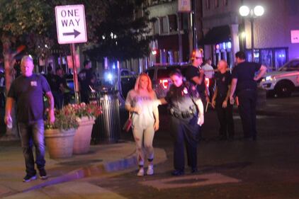 Evidence markers rest on the street at the scene of a mass shooting Sunday, Aug. 4, 2019, in Dayton, Ohio. Nine people were killed and dozens injured when a gunman opened fire in the city's Oregon District early Sunday morning.