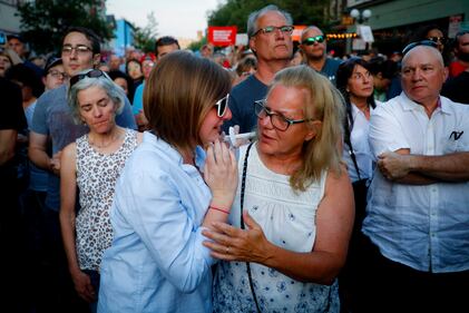 Residents comfort each other as they await word on whether they know any of the victims of a mass shooting on Sunday, Aug. 4, 2019, in Dayton, Ohio.