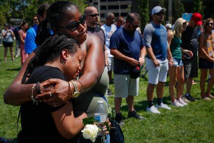 Mourners comfort one another during a vigil at the scene of a mass shooting, Sunday, Aug. 4, 2019, in Dayton, Ohio. A masked gunman opened fire early Sunda, killing nine people, including his sister, and wounding dozens more.