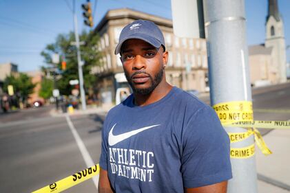 Eyewitness Anthony Reynolds stands for a portrait at the scene of a mass shooting, Sunday, Aug. 4, 2019, in Dayton, Ohio. Police said nine people were killed when a gunman opened fire in the city's Oregon District early Sunday morning.
