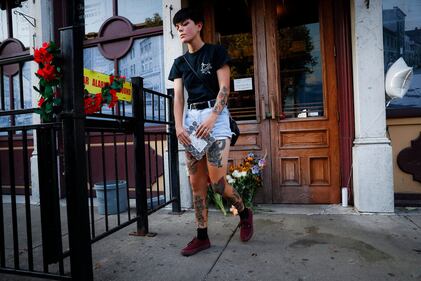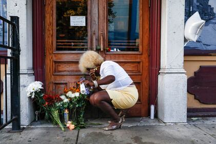 A mourner places flowers at the front of Ned Peppers bar as they gather at the scene of a mass shooting before a prayer vigil, Sunday, Aug. 4, 2019, in Dayton, Ohio.