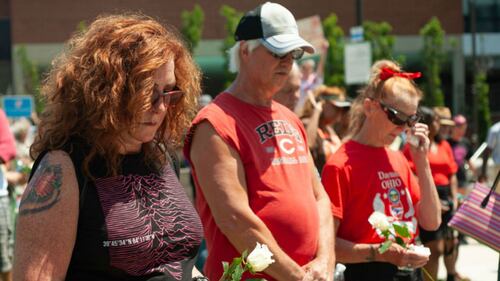 People gather for a vigil at the Levitt Pavilion for the victims of the mass shooting that occurred early Sunday morning in Dayton, Ohio.