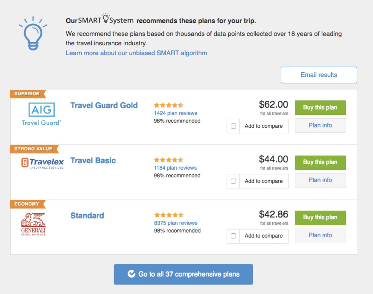 The site will then recommend travel insurance plans for you and show you the cost, plan details and consumer ratings.