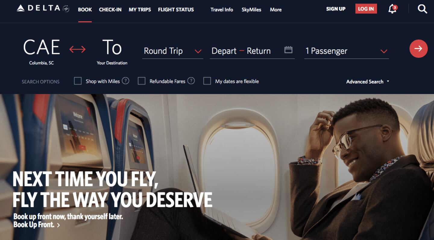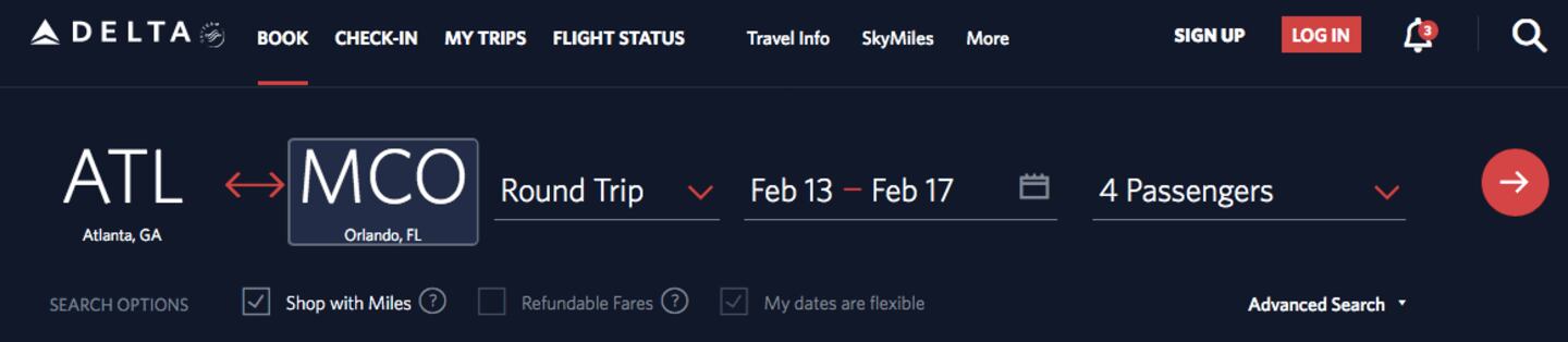 First, I would go to the Delta homepage, put in my trip details and check the “Shop with Miles” box: