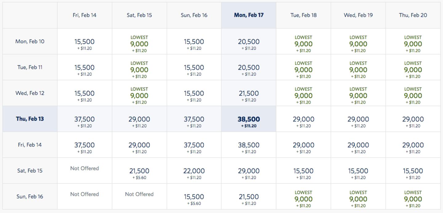 The resulting grid shows me that each ticket will cost me between 9,000 and 38,500 miles, depending on when I choose to travel. That’s quite a spread!