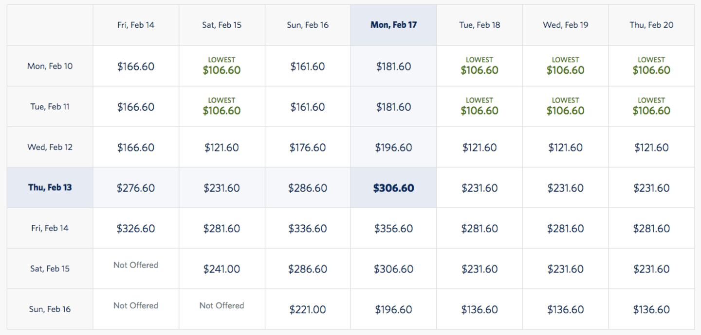 As you can see from the grid, the price in dollars for the same ticket during the same dates is $121.60. Subtracting $11.20 from that price (the taxes and fees that would be added to a miles ticket) gives us $110.40. That means that our miles, in this case, would be worth around 1.23 cents a piece ($110.40 / 9,000 = $0.0123) — or slightly higher than average. It would probably make sense to use the miles for these tickets.