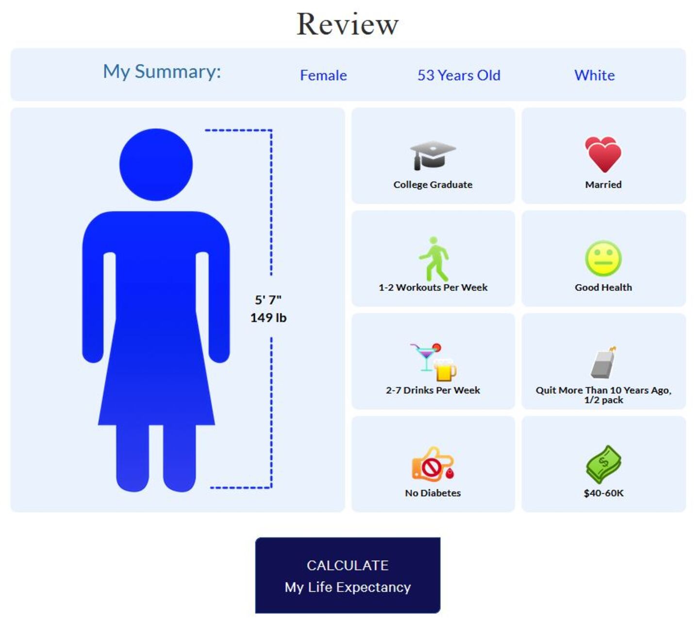It includes questions about your age and physique, life events, fitness and lifestyle. You’ll get a customized life expectancy based on 400,000 data samples from the National Institutes of Health.