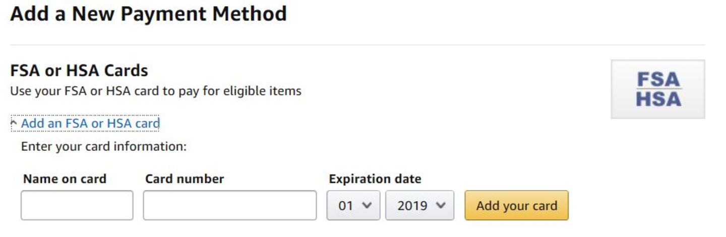 1. Add your FSA or HSA card as a payment option to your Amazon account. Click here to get started.