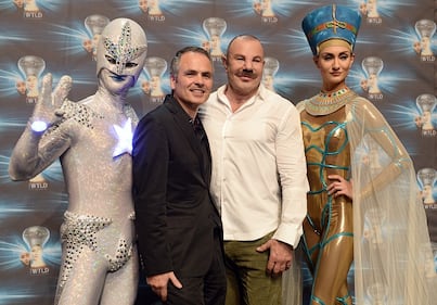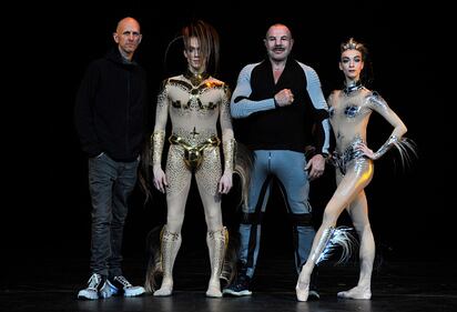 Photos: Manfred Thierry Mugler through the years 2014: French fashion designer Thierry Mugler (second right) and director of Friedrichstadt-Palace theater Berndt Schmidt (second left) are pictured on October 10, 2014, in Friedrichstadt-Palace theater in Berlin after a dress rehearsal of the new show "The Wyld - Not of This World." (BRITTA PEDERSEN/DPA/AFP via Getty Images)