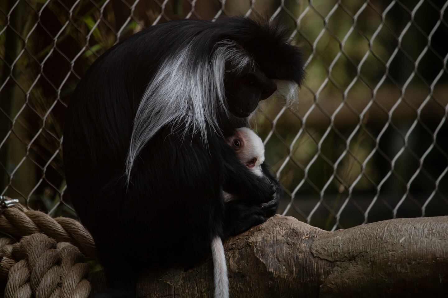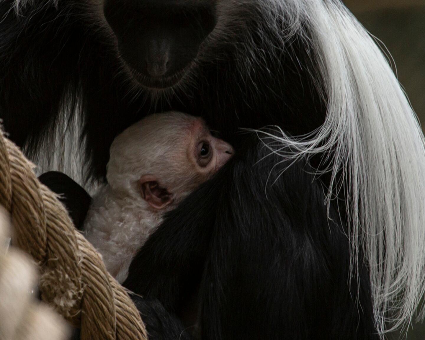 The infant, which can be seen with its family in the Zoo’s Monkeys of Makokou habitat, is easily distinguished by its solid white color. Adult Angolan colobus monkeys are notable for their striking black coats; long, white mantle fur; white whiskers and beards; and white tails. The newborn will gradually acquire this distinctive coloration in coming months.