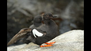 Puffins, murres, and guillemots are all members of the alcid family. Alcids are pelagic seabirds and are uniquely adapted to marine environments. Puffins have small wings and legs set back on their bodies, making them excellent swimmers and divers. But, this also makes them very clumsy on land and taking flight can be a challenge for these popular birds. Horned puffins have a large orange-to-red beak while tufted puffins have a large orange beak with white coloration around the sides of their heads. Both pigeon guillemots and common murres are dark brownish-black birds with red legs.