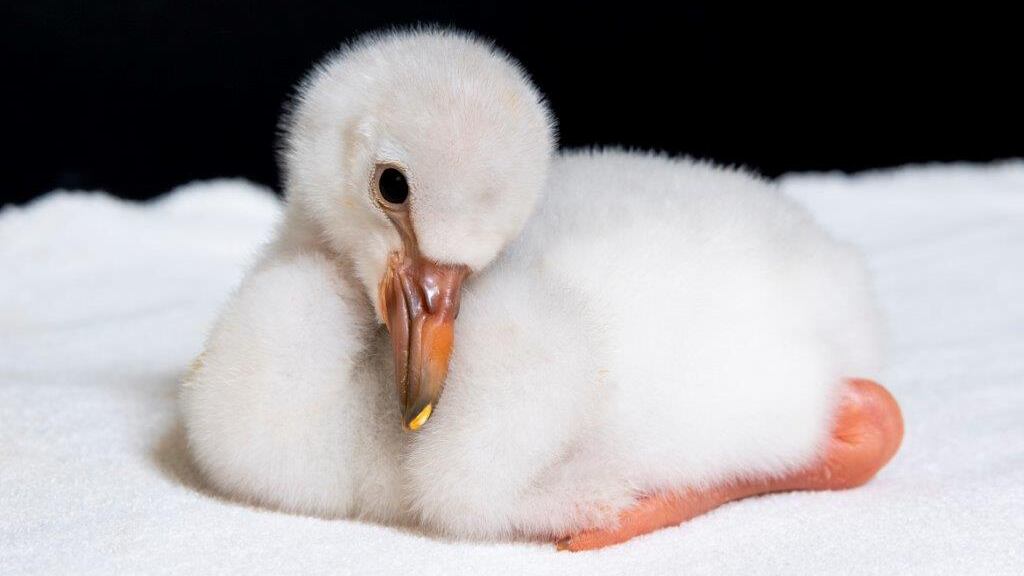 Chilean flamingos are white at hatching, later turning grey. It will be many months before the 2018 chicks begin to show signs of their parents’ signature pink color. The pink coloration is a result of beta caretinoids in flamingos’ diet, both in the wild and in zoos.