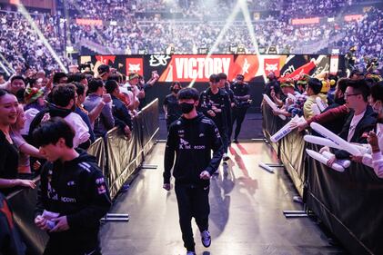 League of Legends World Championship Semifinals ATLANTA, GEORGIA - OCTOBER 29: The T1 squad walks offstage at the League of Legends World Championship Semifinals on October 29, 2022 in Atlanta, GA. (Photo by Liu YiCun/Riot Games) (Liu YiCun)