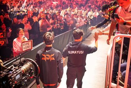 League of Legends World Championship Semifinals ATLANTA, GEORGIA - OCTOBER 29: Lee "Gumayusi" Min-hyeong of T1 (R) and Wang "Hope" Jie of JD Gaming make an entrance at the League of Legends World Championship Semifinals on October 29, 2022 in Atlanta, GA. (Photo by Colin Young-Wolff/Riot Games) (Colin Young-Wolff)
