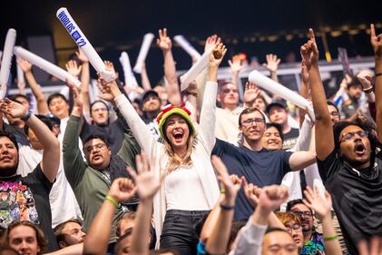 League of Legends World Championship Semifinals ATLANTA, GEORGIA - OCTOBER 29: Fans cheer in the audience at the League of Legends World Championship Semifinals on October 29, 2022 in Atlanta, GA. (Photo by Colin Young-Wolff/Riot Games) (Colin Young-Wolff)