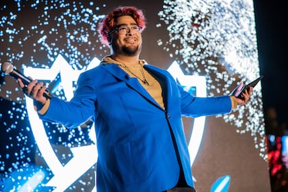League of Legends World Championship Semifinals ATLANTA, GEORGIA - OCTOBER 28: Host Thom "F." Badinger speaks onstage at the Riot Games Official Tailgate Party on October 28, 2022 in Atlanta, GA. (Photo by Colin Young-Wolff/Riot Games) (Colin Young-Wolff)