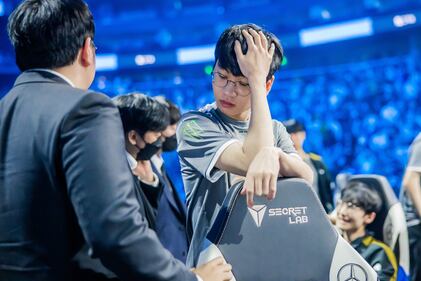 League of Legends World Championship Semifinals ATLANTA, GEORGIA - OCTOBER 30: Choi "Doran" Hyeon-joon of Gen.G reacts onstage after elimination by DRX at the League of Legends World Championship Semifinals on October 30, 2022 in Atlanta, GA. (Photo byFernando Decillis/Riot Games) (Fernando Decillis)
