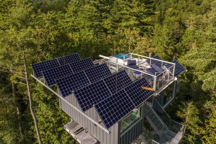 River Forest Lookout River Forest Lookout is comprised of two shipping containers that rise 60 feet above the forest below. The space includes a living area, kitchen, bedroom and bath.