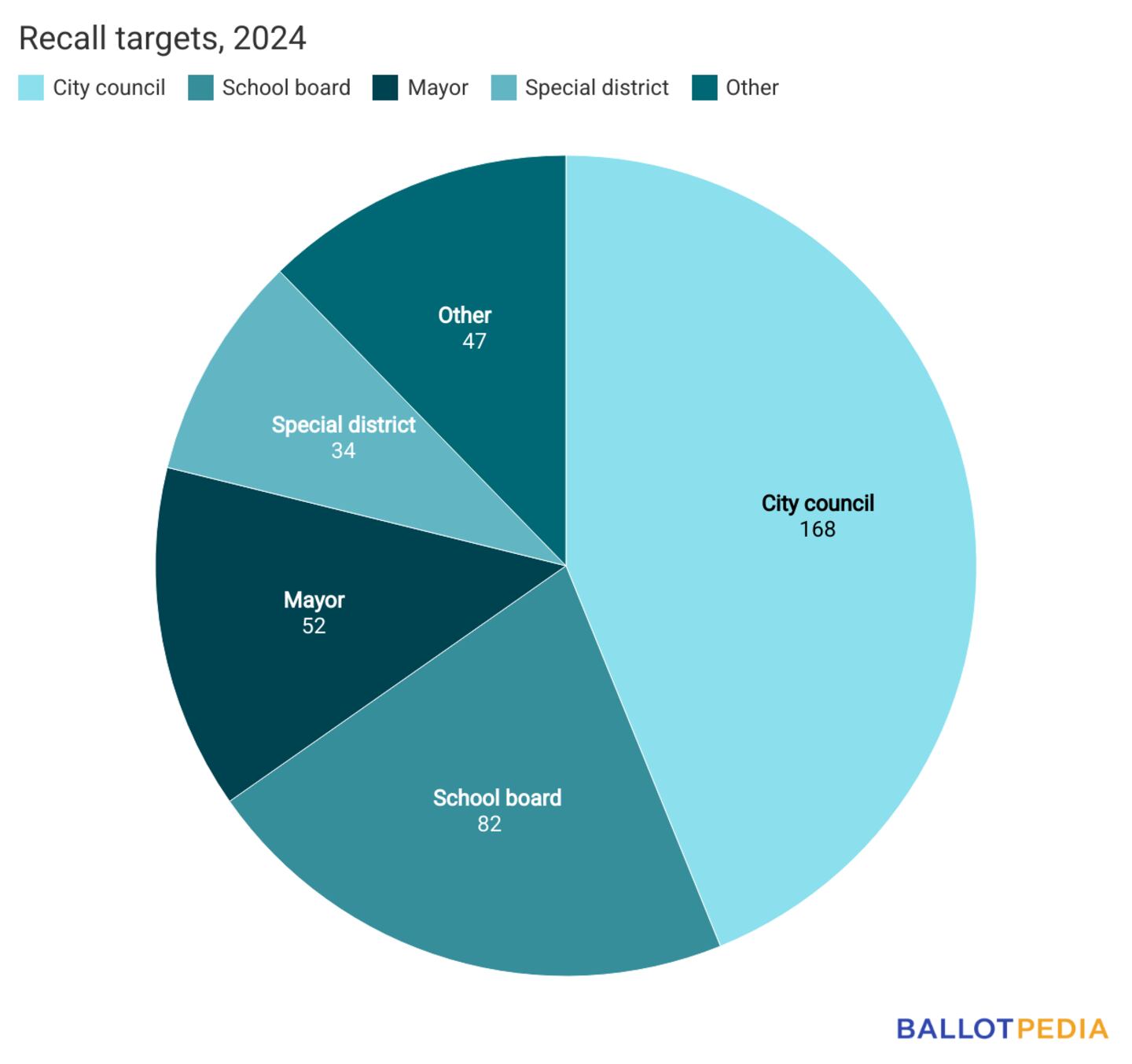 A total of 168 city council or town board members faced recall campaigns, while 82 school board members faced recall campaigns. Recalls were also sought for 52 mayors and vice mayors. At the state level of government, seven state legislators and five state executives faced recall efforts. A breakdown of the various recall targets is displayed in the chart below: