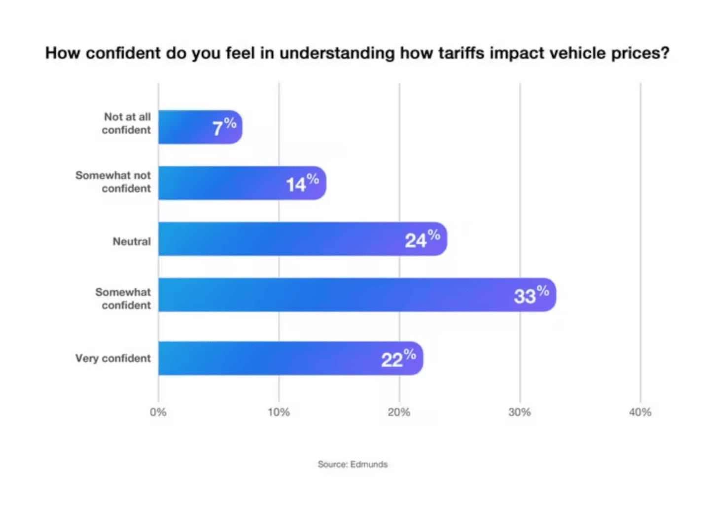 Many shoppers believe they have a good understanding of how tariffs will affect the market. According to Edmunds survey data, 55% said they're somewhat or very confident in their understanding of how tariffs affect vehicle prices. Only 21% said they weren’t confident. Whether or not that confidence is well placed, this level of awareness could make consumer response even more turbulent in the weeks ahead.