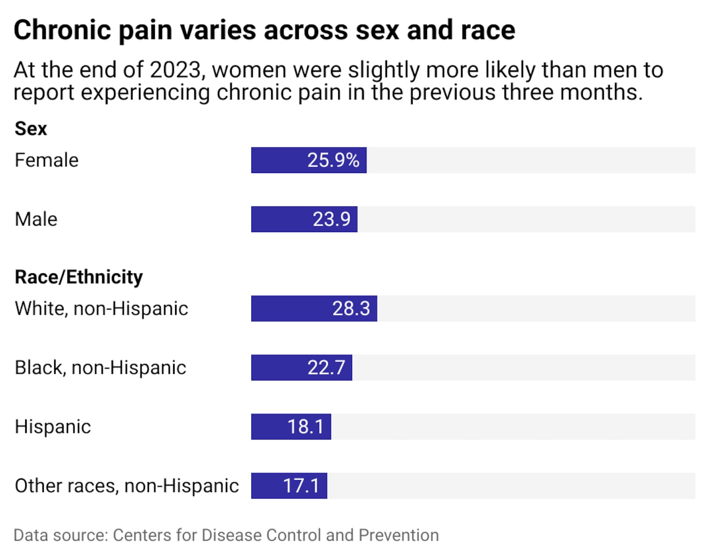 These and other symptoms of chronic pain are often associated with older adults, but chronic pain is a pervasive public health issue that is hard to measure. Nearly 1 in 4 adults said they experienced chronic pain, according to a 2023 survey by the Centers for Disease Control and Prevention. Almost 1 in 10 reported that their daily life or work had been impacted by persistent, debilitating pain in the past three months. On top of the personal toll that chronic pain takes on Americans, the financial cost to the country of health care expenses and lost productivity can exceed hundreds of billions of dollars annually.