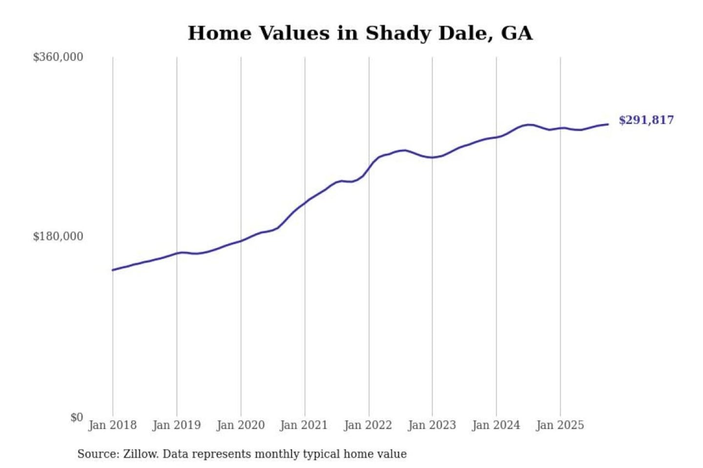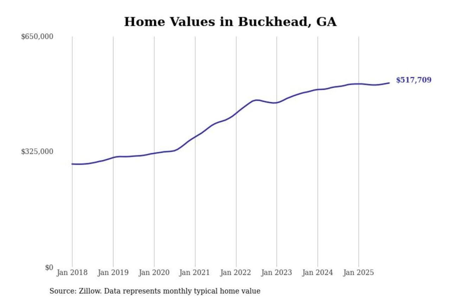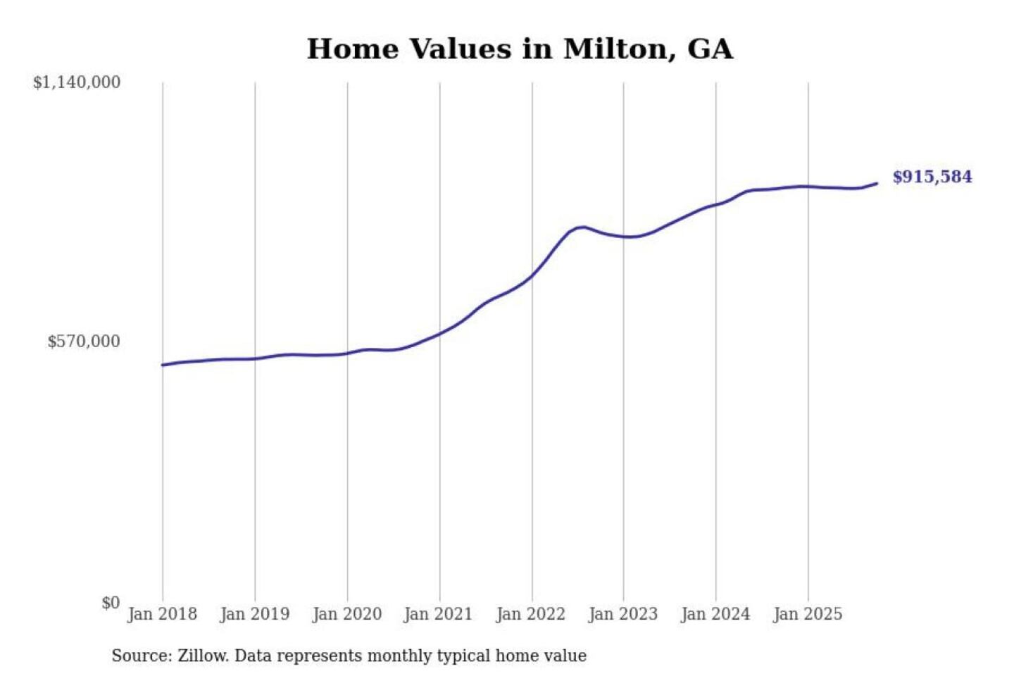 Stacker compiled a list of cities with the most expensive homes in the Atlanta-Sandy Springs-Alpharetta, GA metro area using data from Zillow. Charts show the monthly typical home value since January 2018.