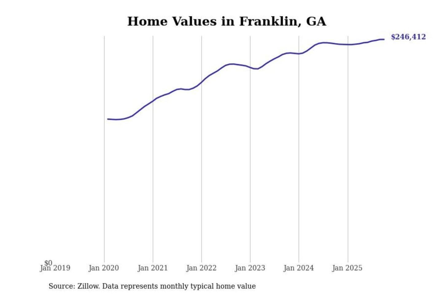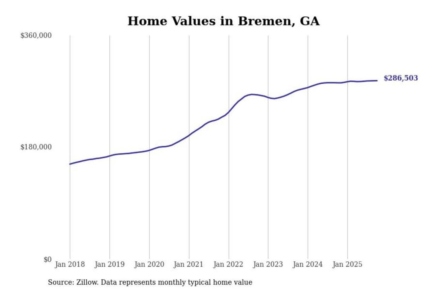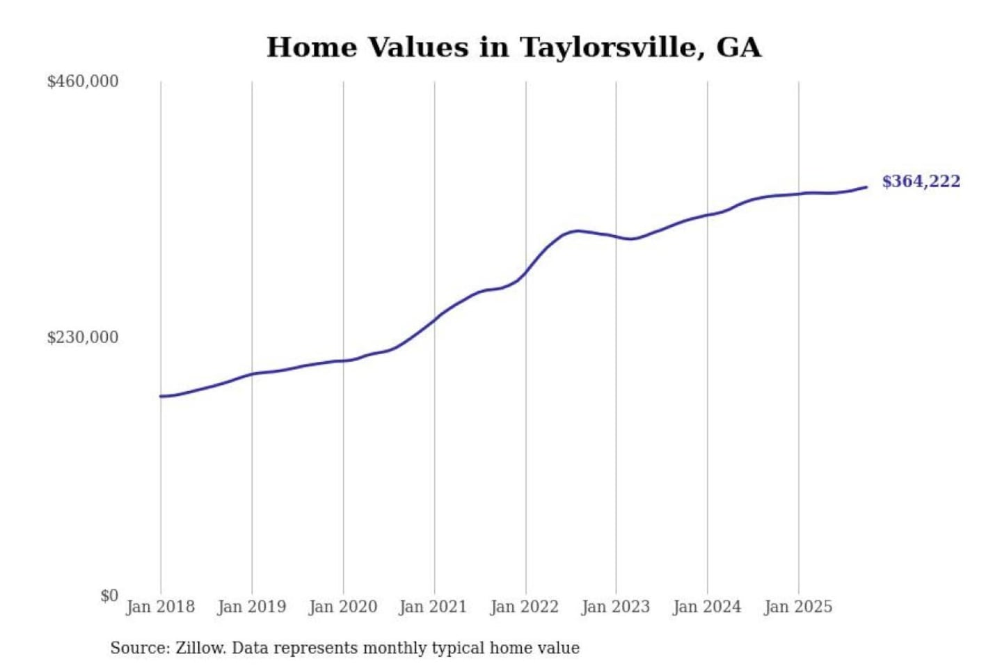 Stacker compiled a list of cities with the most expensive homes in the Atlanta-Sandy Springs-Alpharetta, GA metro area using data from Zillow. Charts show the monthly typical home value since January 2018.