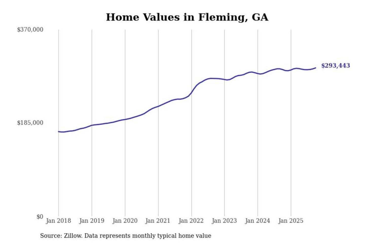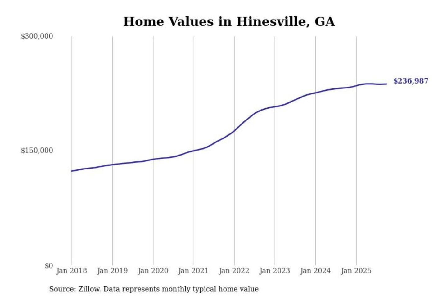 Stacker compiled a list of cities with the most expensive homes in the Hinesville, GA metro area using data from Zillow. Charts show the monthly typical home value since January 2018.