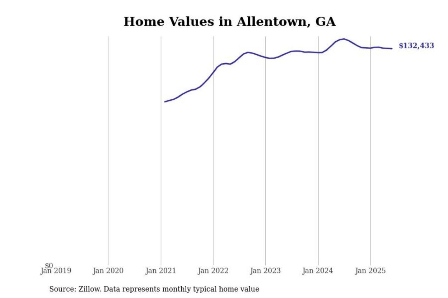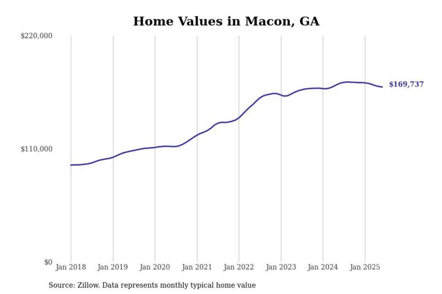 Stacker compiled a list of cities with the most expensive homes in the Macon metro area using data from Zillow. Charts show the monthly typical home value since January 2018. All 14 cities and towns with data available were included in the list.