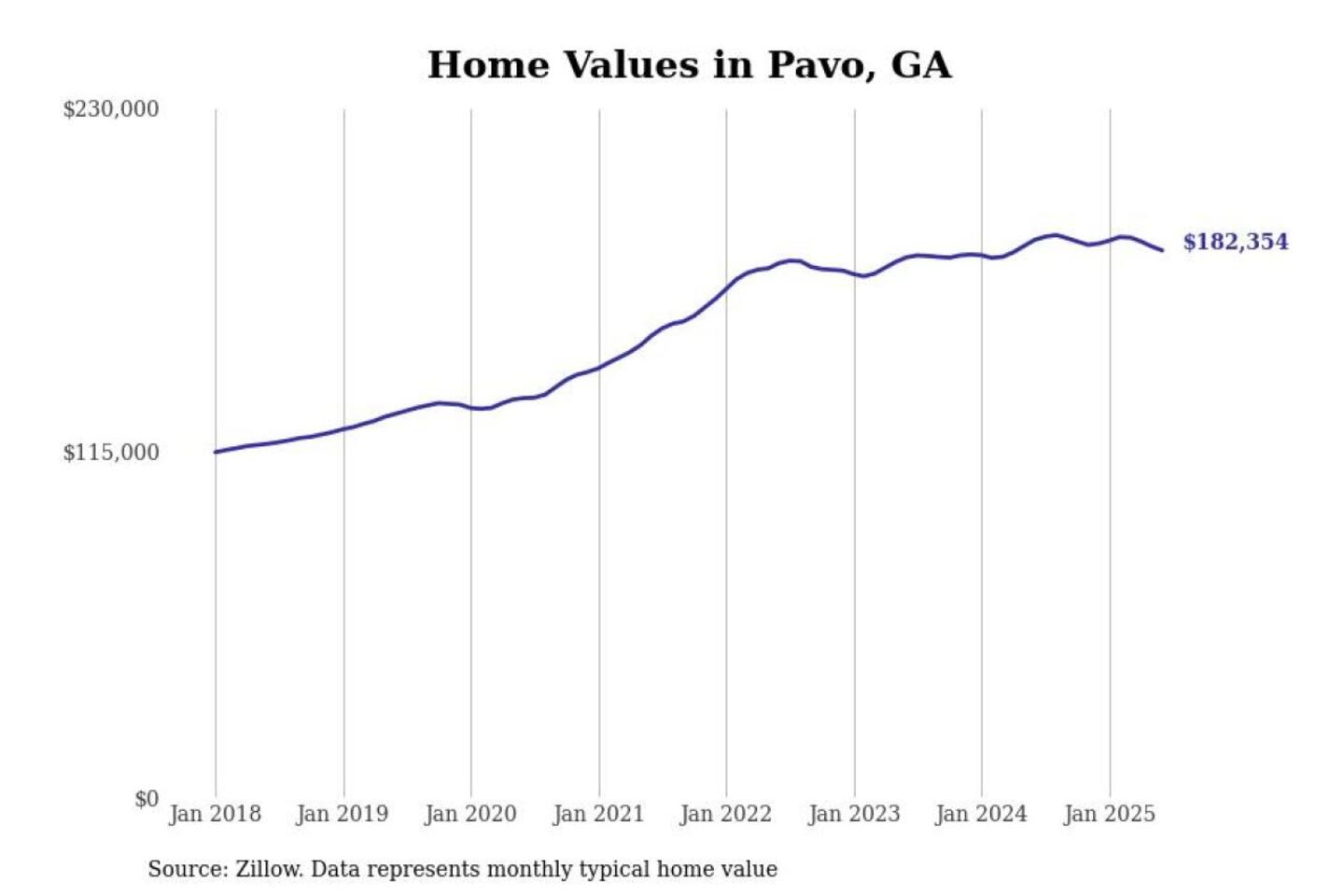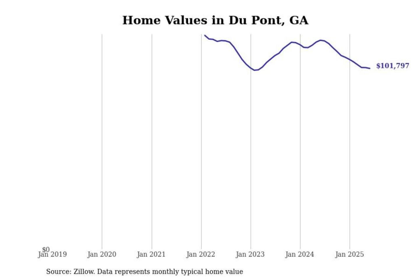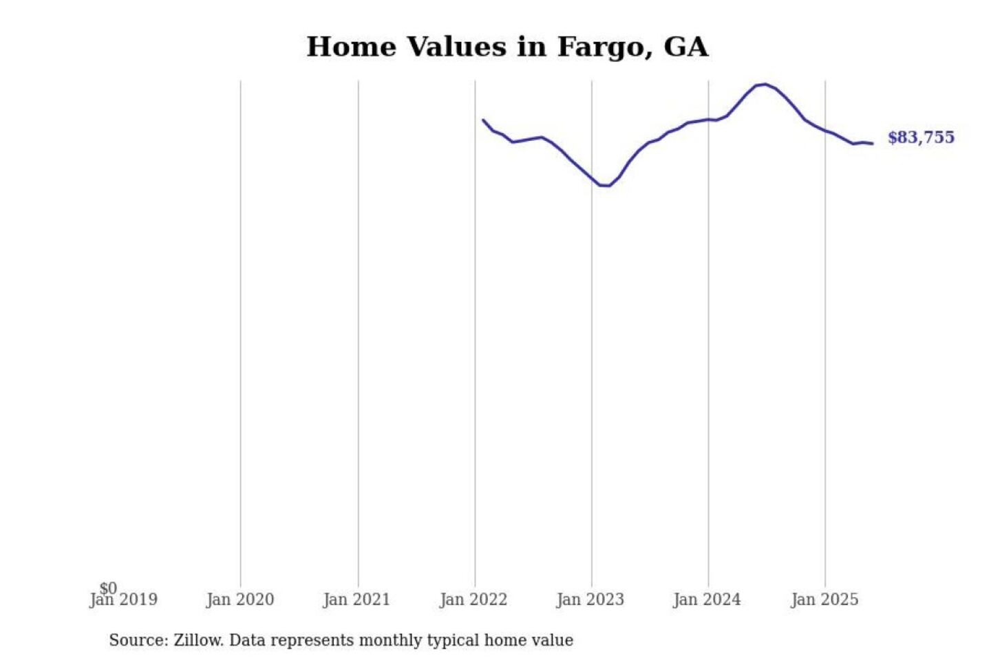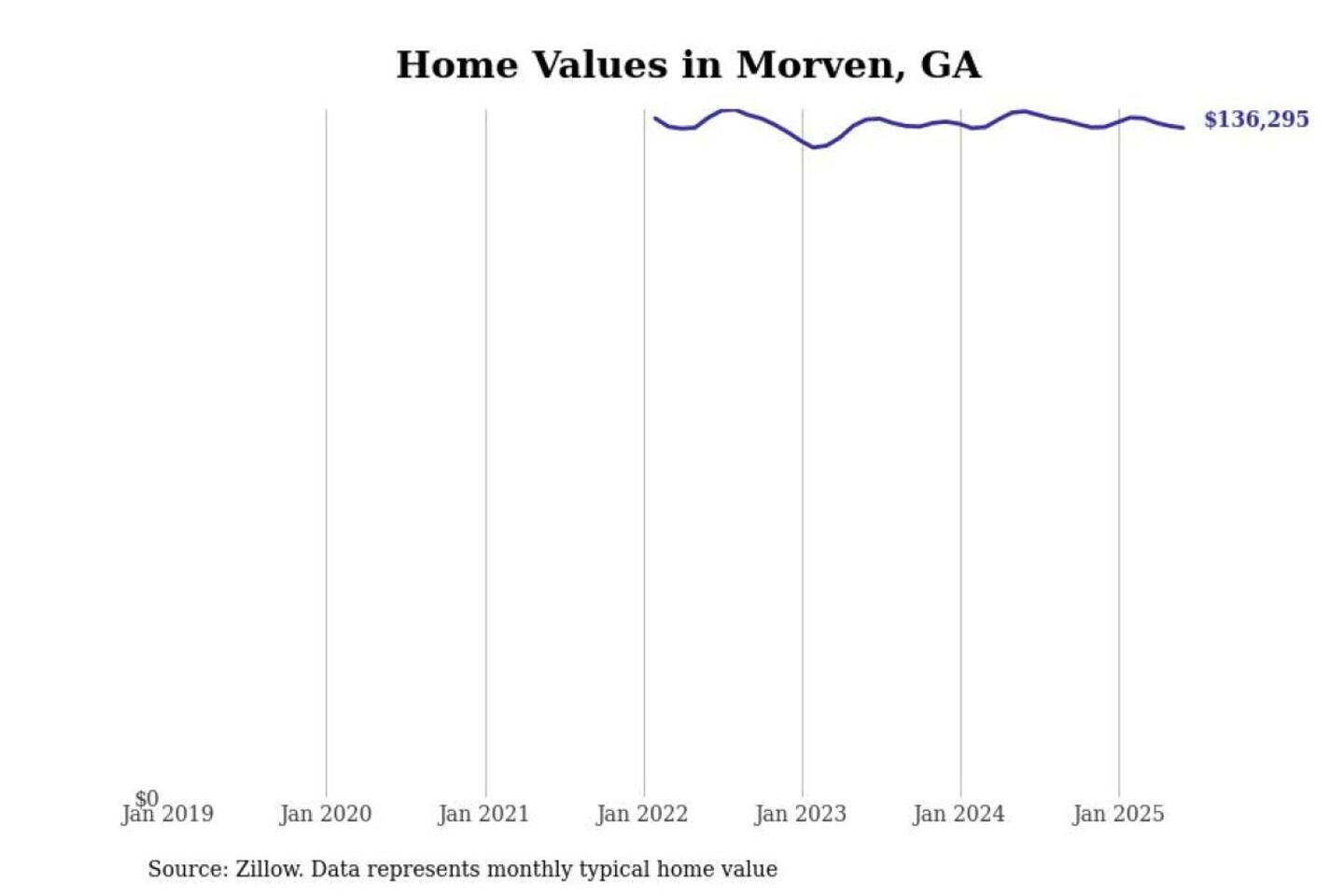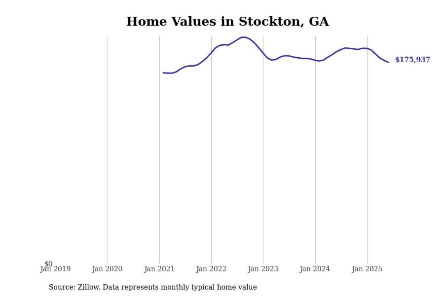 Stacker compiled a list of cities with the most expensive homes in the Valdosta metro area using data from Zillow. Charts show the monthly typical home value since January 2018. All 17 cities and towns with data available were included in the list.