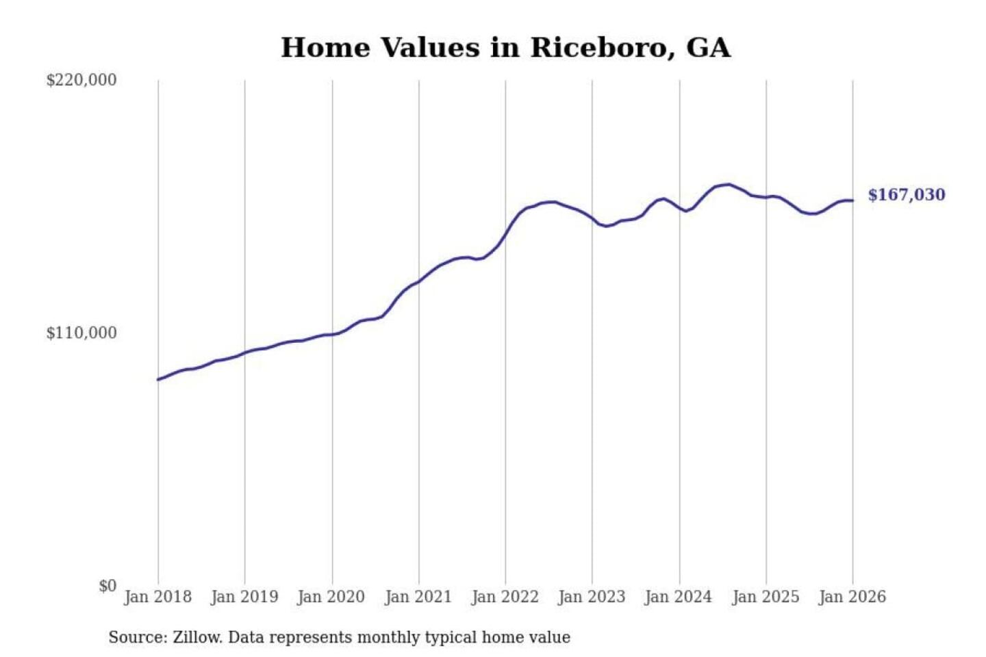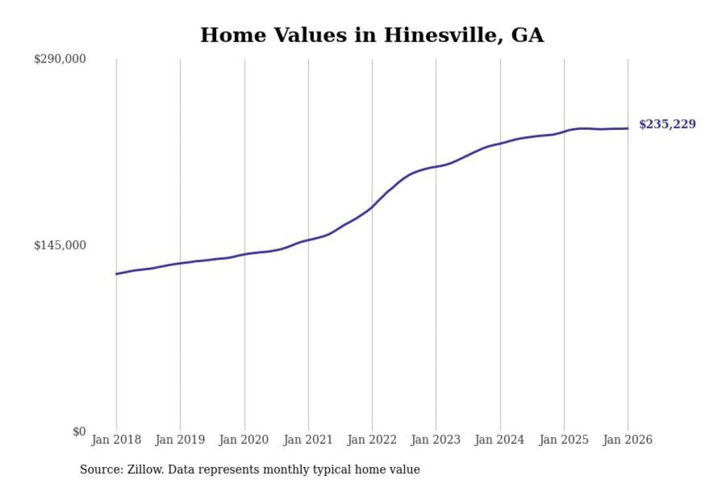 Stacker compiled a list of cities with the most expensive homes in the Hinesville metro area using data from Zillow. Charts show the monthly typical home value since January 2018. All 8 cities and towns with data available were included in the list.