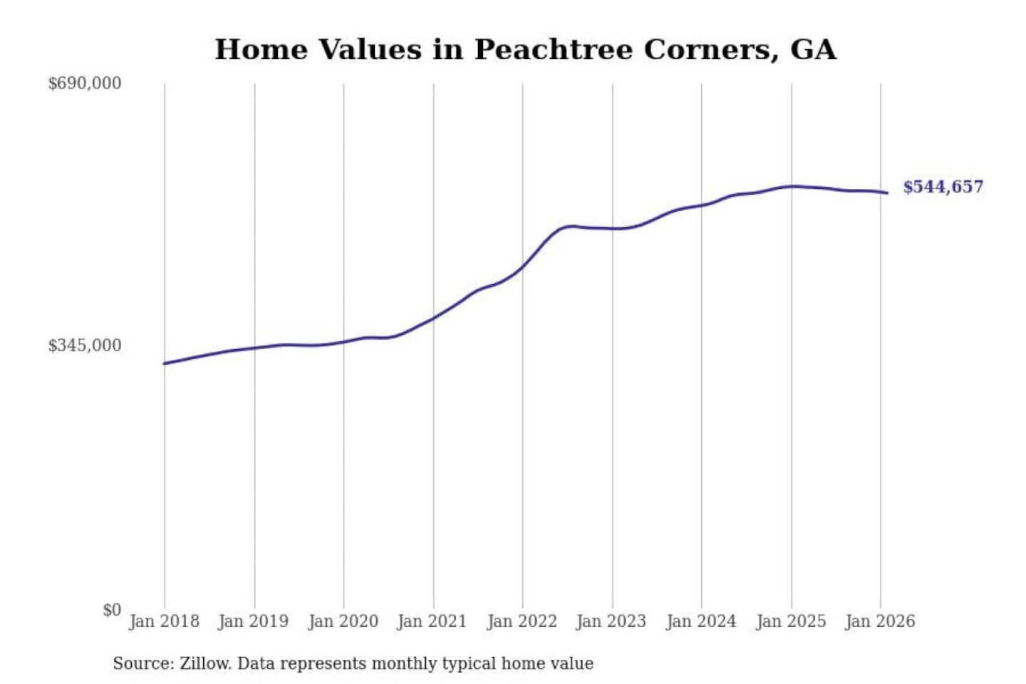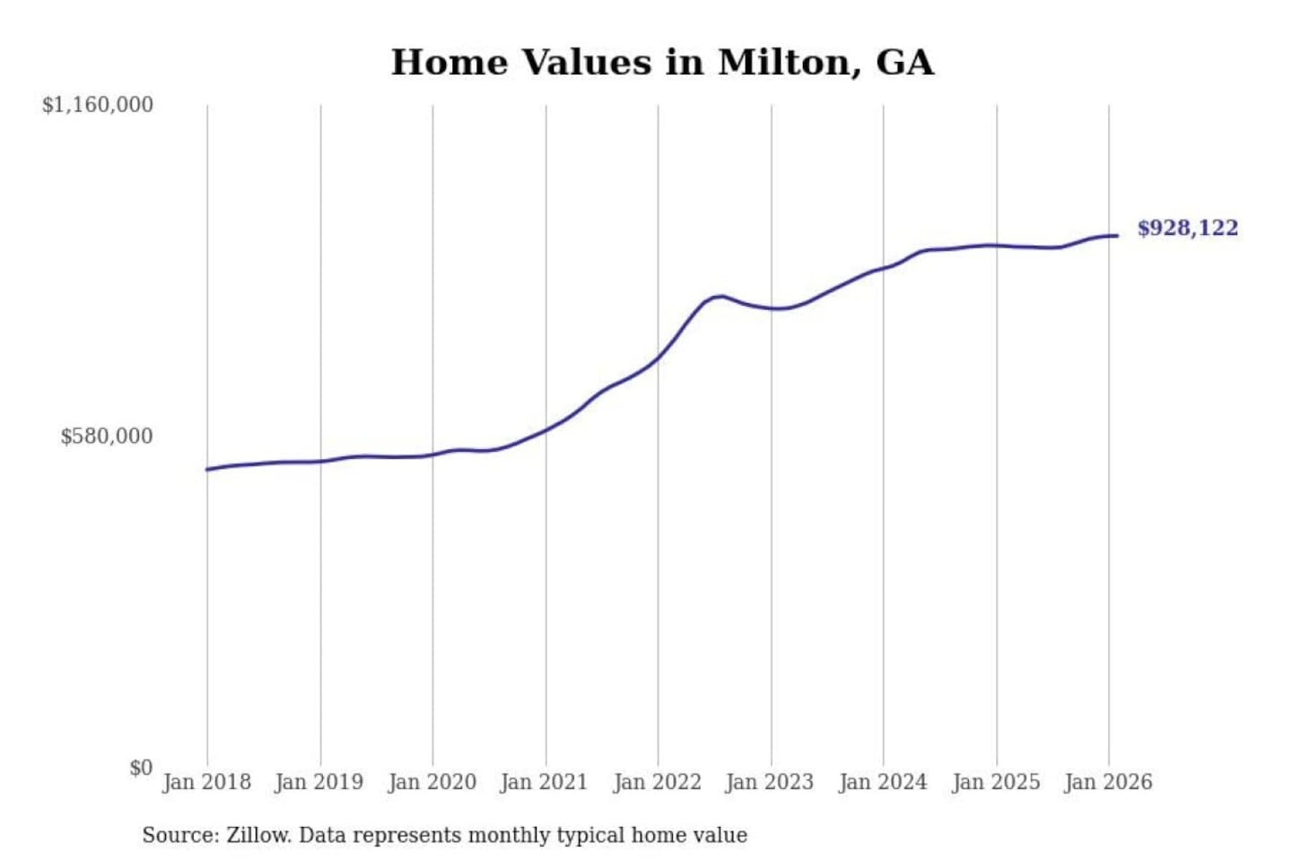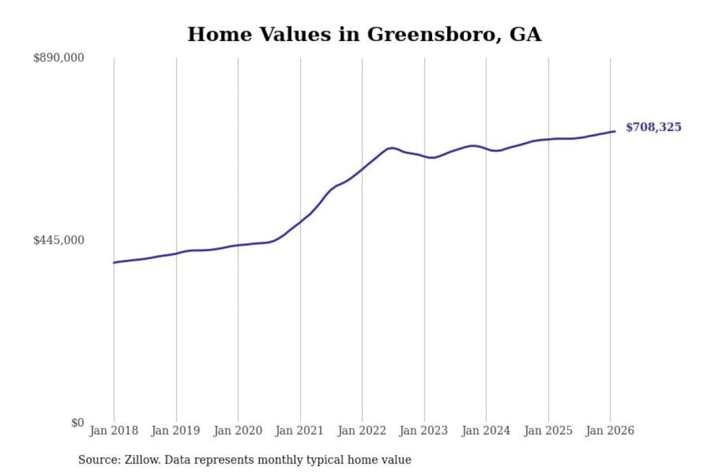 Stacker compiled a list of cities with the most expensive homes in Georgia using data from Zillow. Cities are ranked by the Zillow Home Values Index for all homes as of February 2026. The charts in this story were created automatically using Matplotlib.