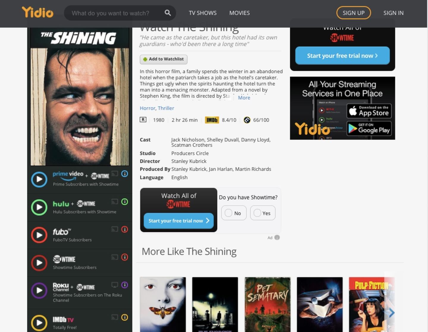 Instead of seeing a media player and watching a video directly on Yidio.com, you can instantly search for titles across a variety of other platforms including Tubi, Vudu, Crackle, The Roku Channel and over 100 more.