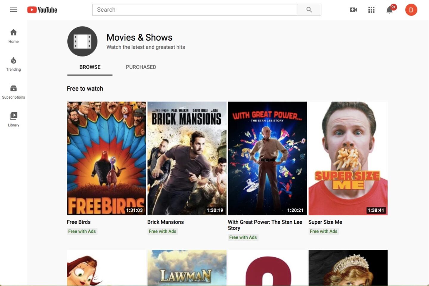 To see the current selection of movies that are free to watch, visit this YouTube page. You'll find several popular kids' titles, documentaries and classic favorites. While you won't have to create an account in order to browse or watch select free movies, you may have to sign in to verify your age if the title is rated R.