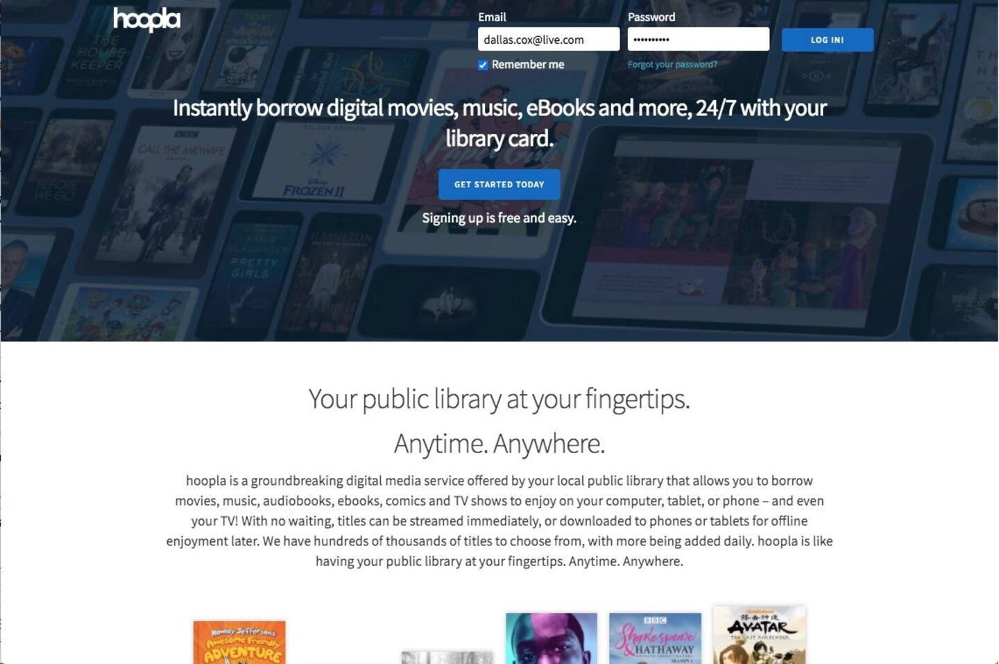 Hoopla works just like a public library, which means you can instantly borrow digital movies at any time using your library card. If you don't already have an account, you sign up for free online. You will need to log in to be able to "borrow" anything.