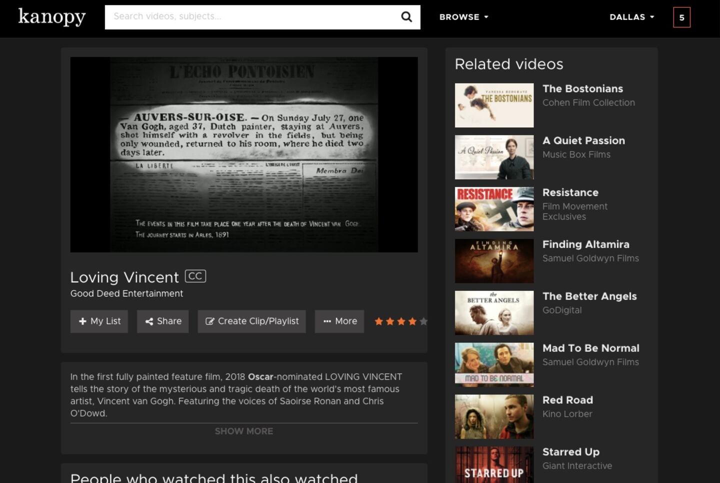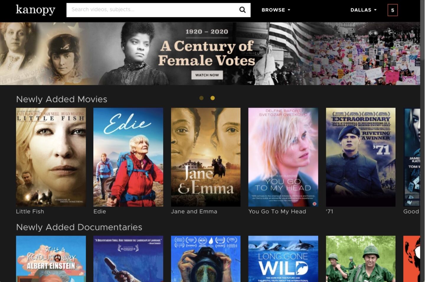Once you're signed in, you can watch up to five films per month. In the top-right corner of the screen, you'll see a number indicating how many "credits" you have remaining for the month or how many programs you can watch. You can enjoy unlimited plays in the Kanopy Kids section.