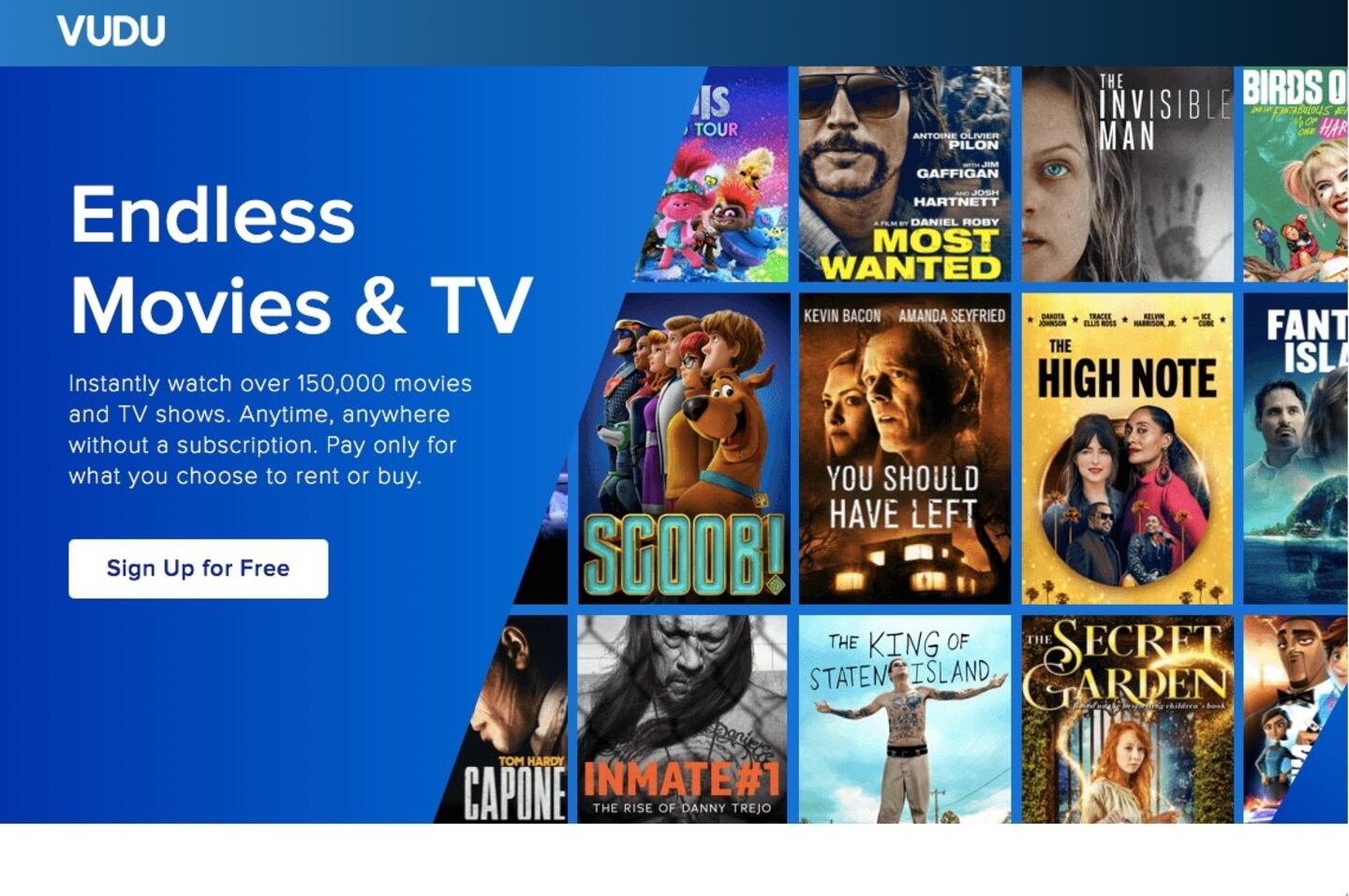 Formerly owned by Walmart, Vudu is now a digital video store and streaming service owned by Fandango Media. You can rent and buy films from Vudu, but you'll also find a selection of free movies and TV shows that you can stream with ads.