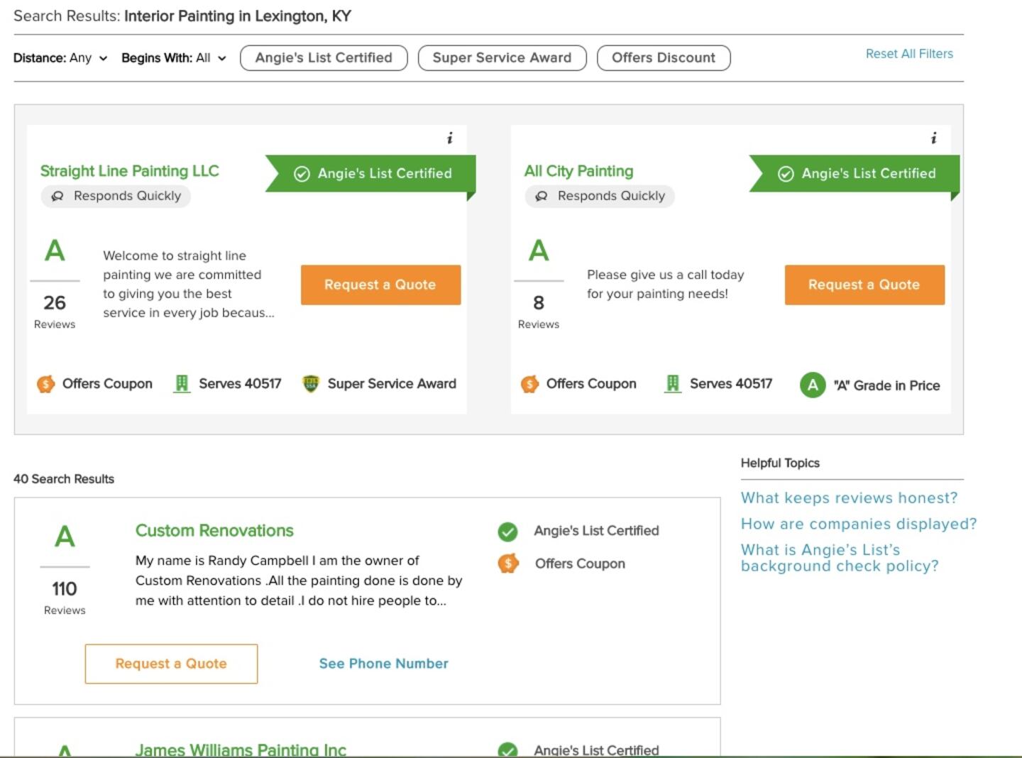 You may notice that some businesses are Angie's List Certified. These companies are paying to advertise their services and discounts to members and will appear higher on your search results. They have also met the following standards: