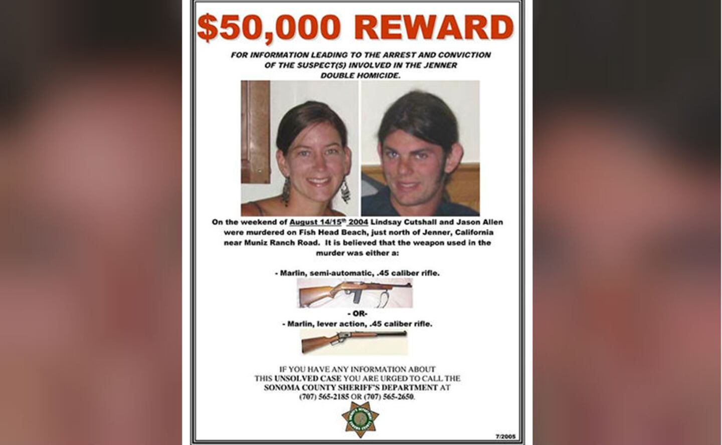 Pictured is a reward poster for information in the 2004 deaths of Lindsay Cutshall and Jason Allen, who were killed as they slept on a beach near Jenner, Calif. Their killer, Shaun Gallon, was sentenced to life in prison Monday, July 15, 2019.