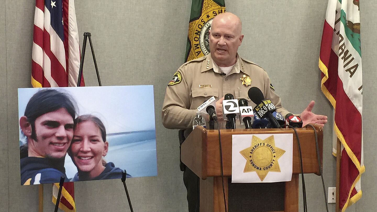 Sonoma County Sheriff Steve Freitas announces the arrest in 2017 of Shaun Gallon in the slayings of Jason Allen and Lindsay Cutshall, pictured at left, as the couple slept on a beach near Jenner in July 2004. Gallon, 40, has been sentenced to life.