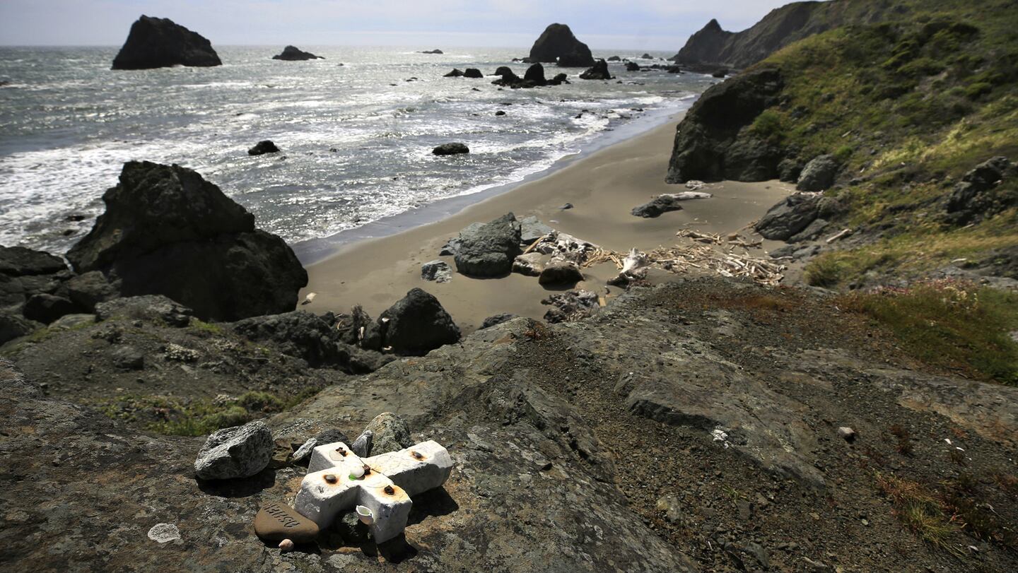 In this May 5, 2017, file photo, a stone memorial cross for Lindsay Cutshall and her fiancé, Jason Allen, is bolted to a cliff above Fish Head Beach near Jenner, Calif., where the couple was found slain in their sleeping bags in 2004.
