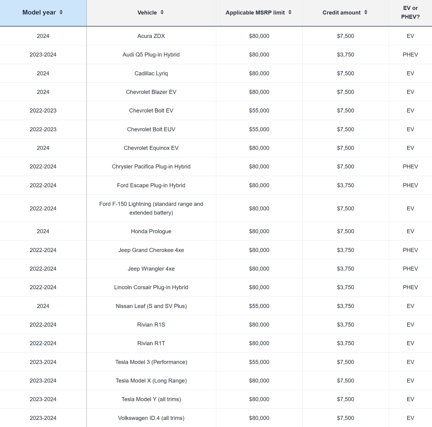 Edmunds kept this list from last year for those who purchased an EV in 2024 and are looking to file their taxes soon. These are the vehicles that were eligible to qualify for up to a $7,500 tax credit.