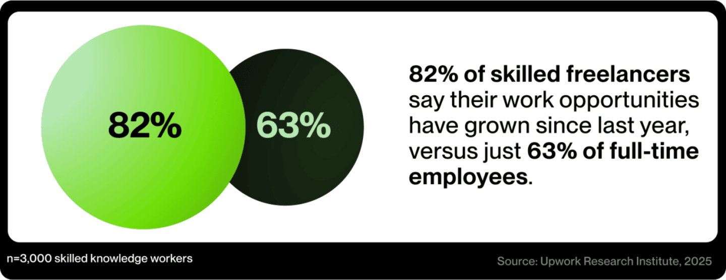 What does this mean for skilled workers? Building a career outside of the confines of the traditional work model has never been more possible, or more advantageous. Skilled knowledge freelancers are at the intersection of innovation, AI, and workforce transformation, and are not only outearning their FTE counterparts today but are also better preparing themselves for the future. While stability was once the promise of full-time employment, a rapidly evolving world of work is revealing this holds true neither for every company nor for every worker. The new promise associated with freelance work is control, self-development, and meaning.
