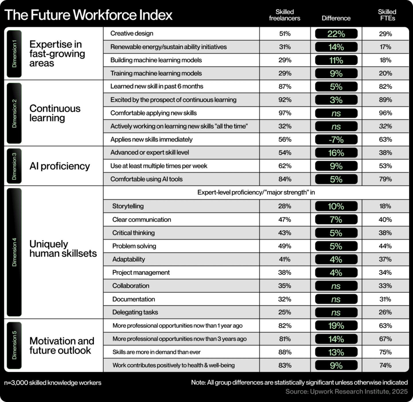 - Skilled freelancers are proving to be more future-ready than full-time employees, excelling in emerging fields such as AI, software development, and sustainability while embracing continuous learning and self-directed skill development. They are leading the adoption of AI tools, with over half (54%) reporting advanced proficiency and indicating superior adaptability, critical thinking, and problem-solving abilities—key attributes for navigating an AI-integrated workforce.