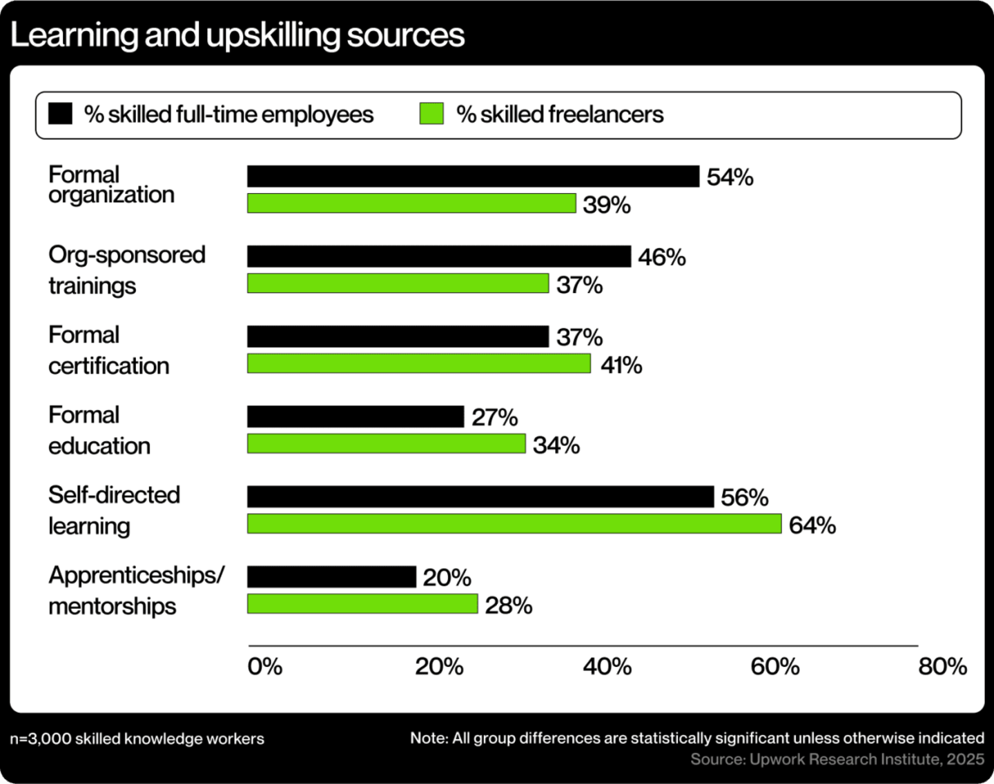 Continuous learning and skill application. Skilled freelancers and full-time employees are both similarly comfortable learning new skills, and both groups are excited by the prospect of continuous learning within their careers. One in 3 (32%) skilled workers say they are actively working on picking up new skills "all the time." Unsurprisingly, most (87% of freelancers and 82% of FTEs) say they have learned a new skill in the past six months. The key difference among these workers is in the learning sources available to them. While skilled full-time employees lean more on formal organizational training (54%) and organizationally sponsored development (46%), skilled freelancers are free to pursue a wider variety of formal, experiential, and social learning opportunities, leaning particularly on self-directed learning (64%), formal certification programs (41%), and apprenticeships and mentorships (28% vs. 20% of full-time employees that do the same; see Figure 3).