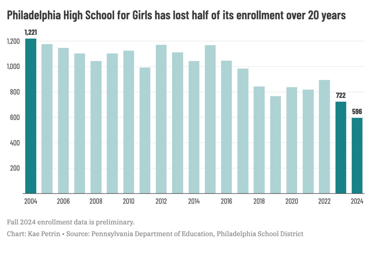 But just like the number of Girls High students, district enrollment has fallen in recent years. The year after Argro graduated high school, district-run schools enrolled 205,000 students; that figure has now fallen to around 120,000, due to both charter proliferation and a city population dip.